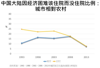 进一步,因为经济困难本来应该住院而决定不住院的比例(图九),农村在1993年、1998年及2003年是在20-25%之间,这个比例在2008年开始下降,到2013年就剩下7%。城市这个问题比较农村好,但是1993年到2008年之间,本来该住院而因为经济困难决定不住院的比例,是陆续上升的—从11%到18%,2013年则下降到与农村一样的7%。上面有关中国大陆民众因经济困难没有就诊或没有住院的趋势反映,大陆近几年全力推动基本医疗保险的政策确实多少疏解了民众因为经济能力而阻碍他们获取医疗的能力。