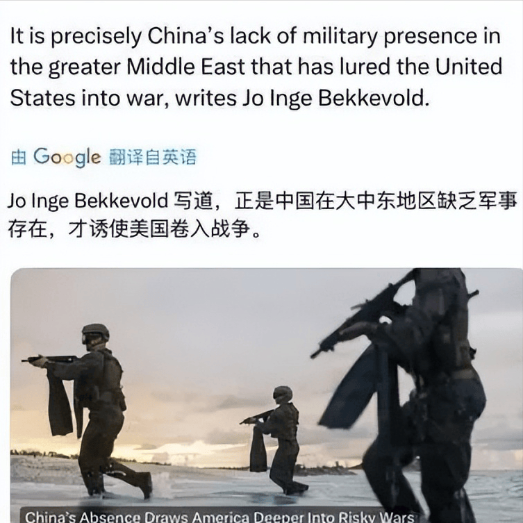最后,说一件最近特别让人哭笑不得的事情。看到美国《外交政策》上的一篇文章,大致意思是:中国在中东地区缺乏军事存在,才诱使美国卷入战争……