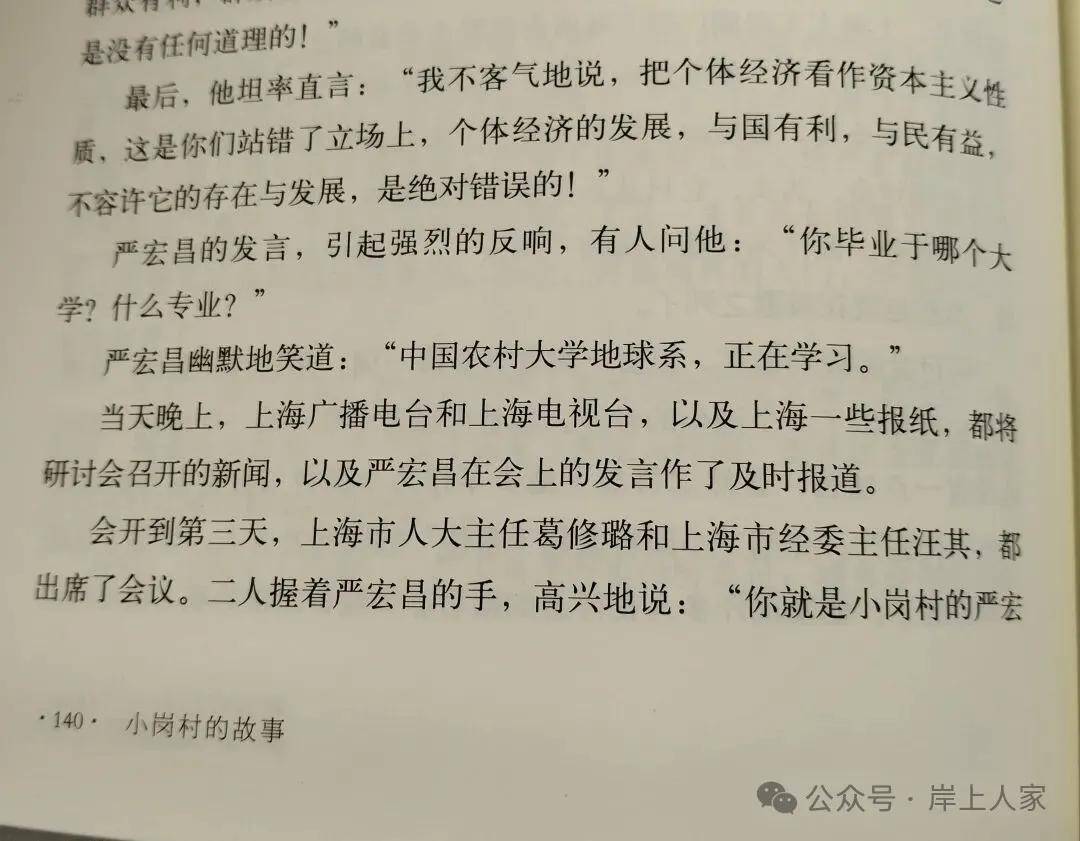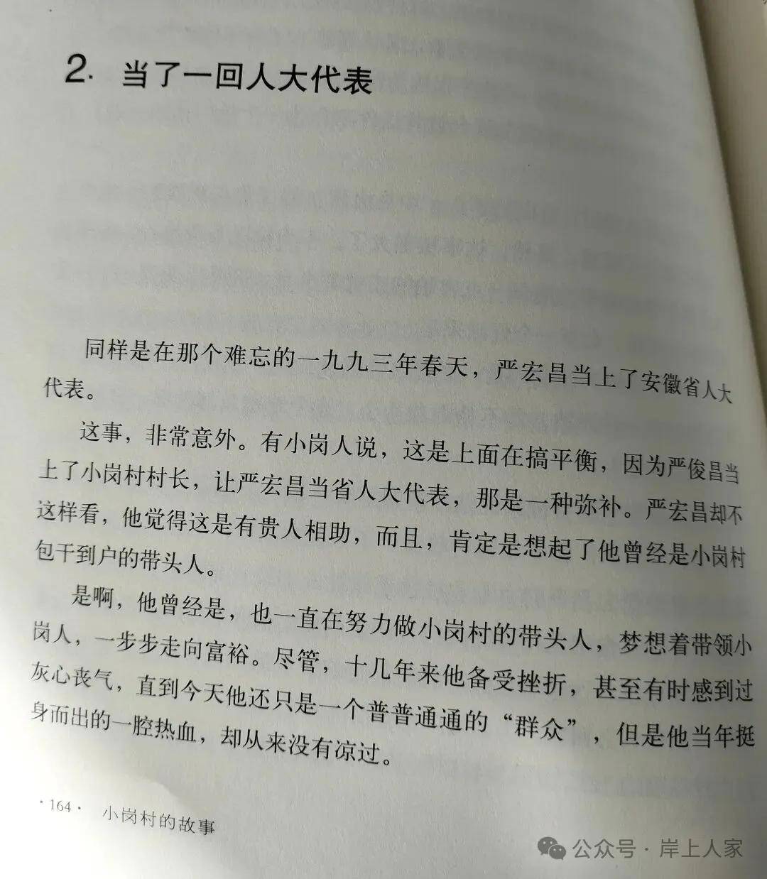 1993年春天,小岗村大包干带头人严宏昌当上了安徽省人大代表。从一名普通群众,成为了省人大代表,身份实现了跃升。 严宏昌从小就是能人,1978年以前,就出去单干,承包到蚌埠铁路局、凤阳县法院的工程项目,发了家。