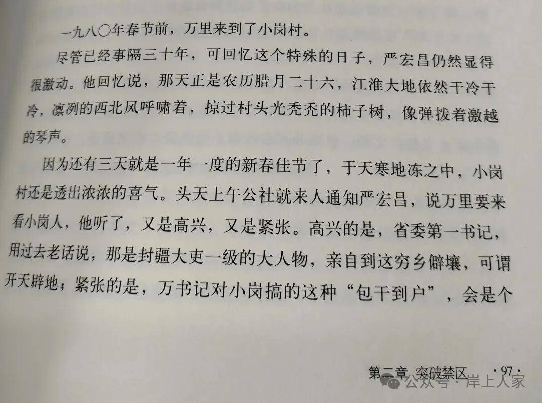 前文提到1980年,安徽省委书记万里专门视察小岗村(小岗村分田单干的经验推广到了全国)。万里在危急关头,顶住压力,公开支持小岗村。按照作者陈桂棣的描述,小岗村民是冒着杀头的风险搞分田单干。万里的表态,直接拯救了小岗村18条人命。