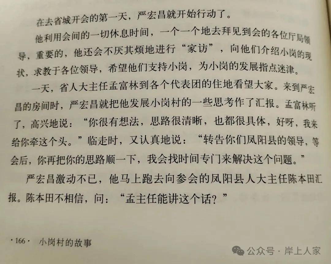 安徽省人大主任兼省委副书记孟富林,把严宏昌尊为座上宾,又是倒水,又是给严宏昌点烟。孟主任召集安徽省各厅局的领导,开了一个小岗村专题联席会。