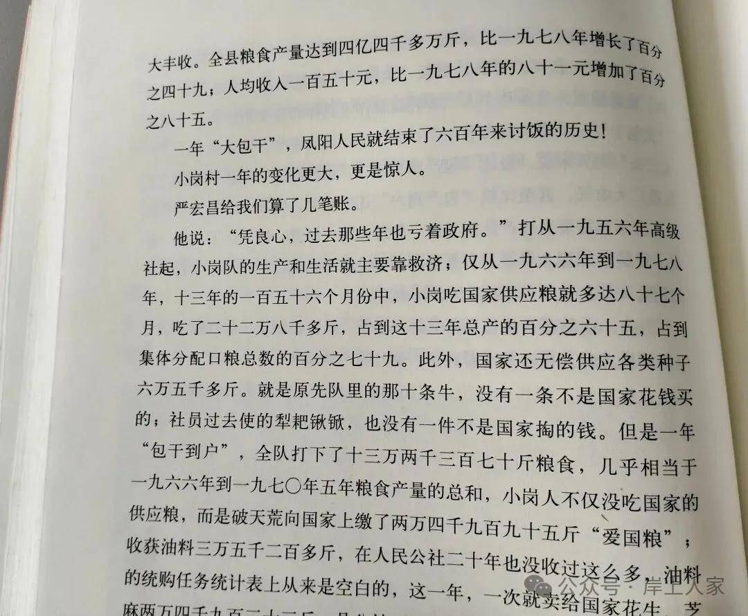 作者陈桂棣写到,1978年大包干了一年,粮食产量大丰收,结束了600年要饭的历史(小岗村分田单干一年,结束了600年的要饭历史!)。