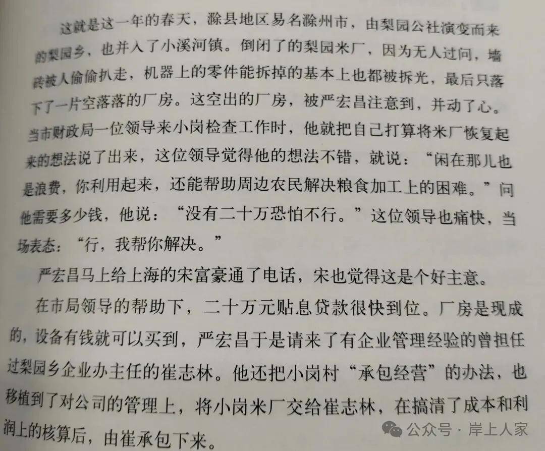 接着,严宏昌又结识了滁州市财政局领导,拿到20万元贷款,办了3家工厂。听严宏昌的讲述,3家红火的工厂被他的堂哥小岗村长严俊昌和镇党委书记许正航,强行霸占,不是卖掉,就是搞倒闭。