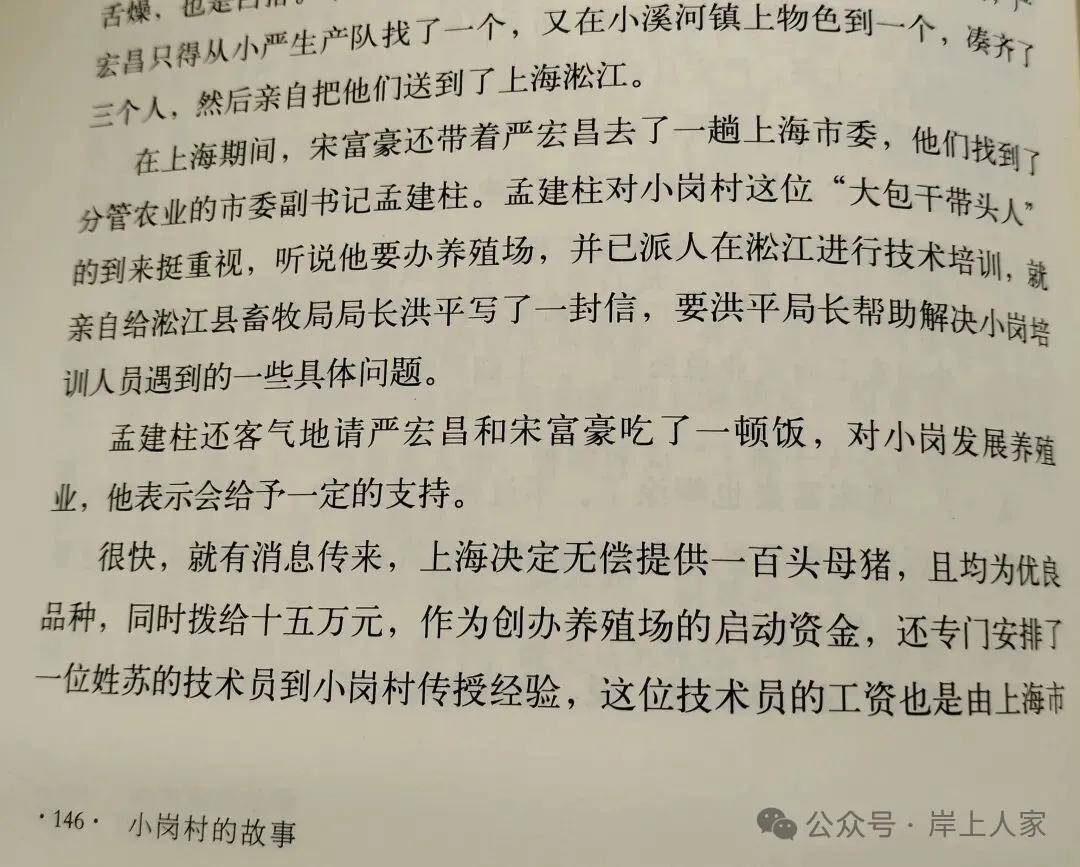 在上海期间,严宏昌还拜访了时任市委副书记的孟建柱同志。很快上海方面决定,无偿送给小岗村100头母猪,15万元人民币,还让上海畜牧局派一名技术员过去指导。(上海无偿援助小岗村,大包干带头人却起了内讧。)