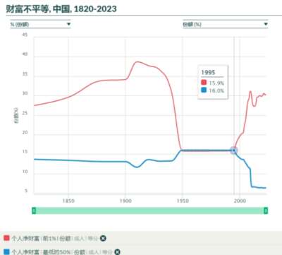 正是在上世纪90年代中后期,贫富差距开始急剧扩大。根据世界收入与财富数据库,中国1820-2023年的占中国人口1%的“精英”与占中国人口50%的普通劳动人民的财富占比如下(红色为精英,蓝色为普通劳动群众):