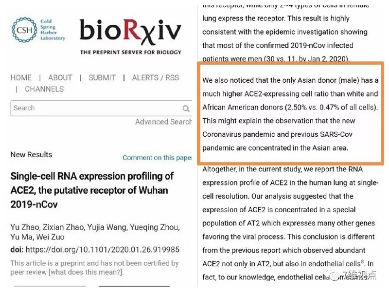 根据冷泉实验室刚发的同济医学院报告说:亚裔男性样本的ACE2表达水平是白人/非洲人的五倍(2.50% vs. 0.47% of all cells)!对欧美基本不构成威胁。