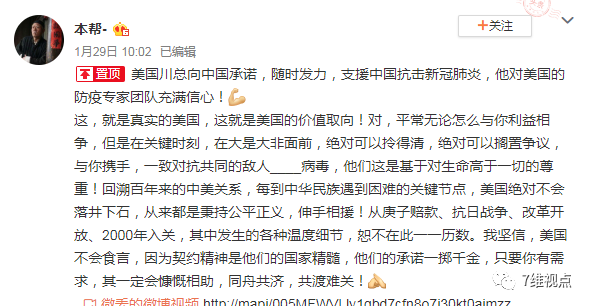 可是,奇怪的是,在这个关头,又有人借助中国的疫情开始了对美国的跪舔,请看: